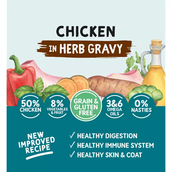 Chicken 50%, Fruit and Vegetables 8% (from 1% Dried Mixed Peppers, Peas and Sweet Potato), Minerals, *Sunflower Oil 0.13%, *Flaxseed Oil 0.06%, *Salmon Oil 0.06%, Dried Kelp 0.06%, *Dried Chicory Root 0.04%, *Yeast 0.04%, Dried Basil 0.016%, Dried Nettle 0.01%, Yucca Powder 0.01%, Dried Rosehip 0.006%, Glucosamine 0.005%, Chondroitin Sulphate 0.0025%, Dried Marigold 0.002%, Pomegranate Extract 0.002%, : *Dried Chicory Root and Yeast as Sources of Prebiotic FOS & Mos to help support healthy digestion.
