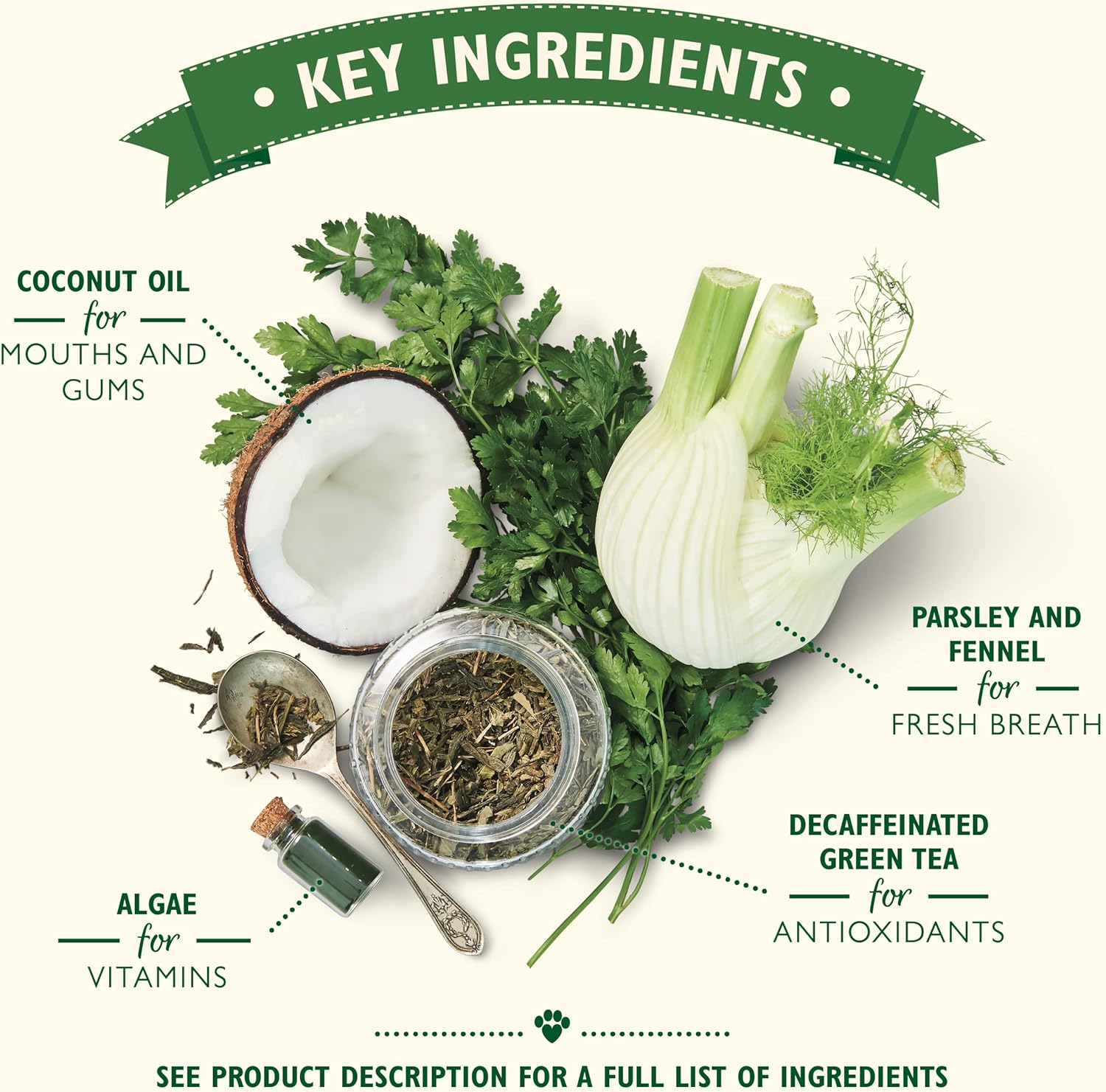 Potato Flour, Tapioca Starch, Glycerine, Cellulose, Algae (1.8%), Dried Yeast, Fennel (0.3%), Coconut Oil (0.3%), Chicory Root (Source of Inulin), Parsley (0.1%), Psyllium Seed Husk (0.05%)