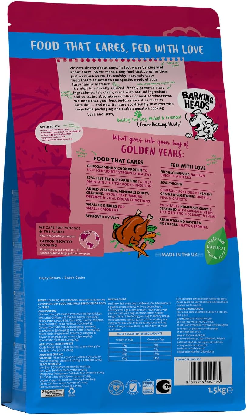 Chicken 50% (23% Freshly Prepared Free Run Chicken, 23% Dried Chicken, 4% Chicken Gravy), Rice (26%), Barley, Potato, Peas (8%), Oats (6%), Lucerne, Minerals, Salmon Oil (1%), Yeast Products (1000mg/kg), Chicory Root Extract (FOS 1000mg/kg), Seaweed, Glucosamine (500mg/kg), Dried Carrot (500mg/kg), Mixed Herbs (Peppermint, Rosemary, Oregano & Thyme 500mg/kg), Beta Glucans (300mg/kg), Chondroitin Sulphate (150mg/kg)