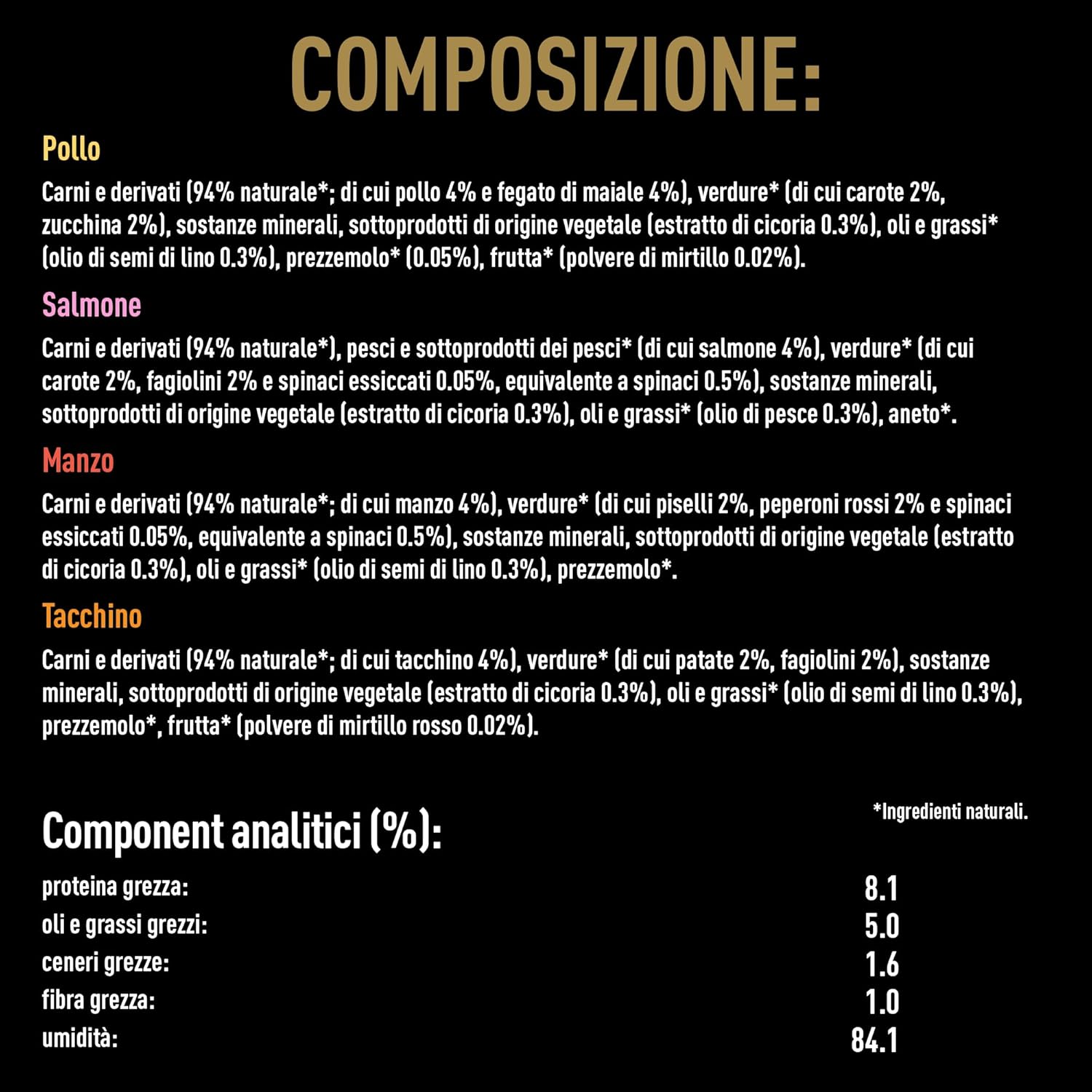 Meat and Animal Derivatives (94% Natural*), Fish and Fish Derivatives* (including Salmon 4%), Vegetables* (including Carrots 2%, Green Beans 2% and Dried Spinach 0.05%, equivalent to Spinach 0.5%), Minerals, Derivatives of Vegetable Origin (Chicory Extract 0.14%), Oils and Fats* (Fish Oil 0.14%), Dill*, *Natural ingredients.