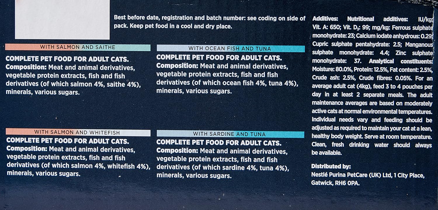 Meat and Animal Derivatives, Vegetable Protein Extracts, Fish and Fish Derivatives (Sardine 4%, Tuna 4%), Minerals, Various Sugars
