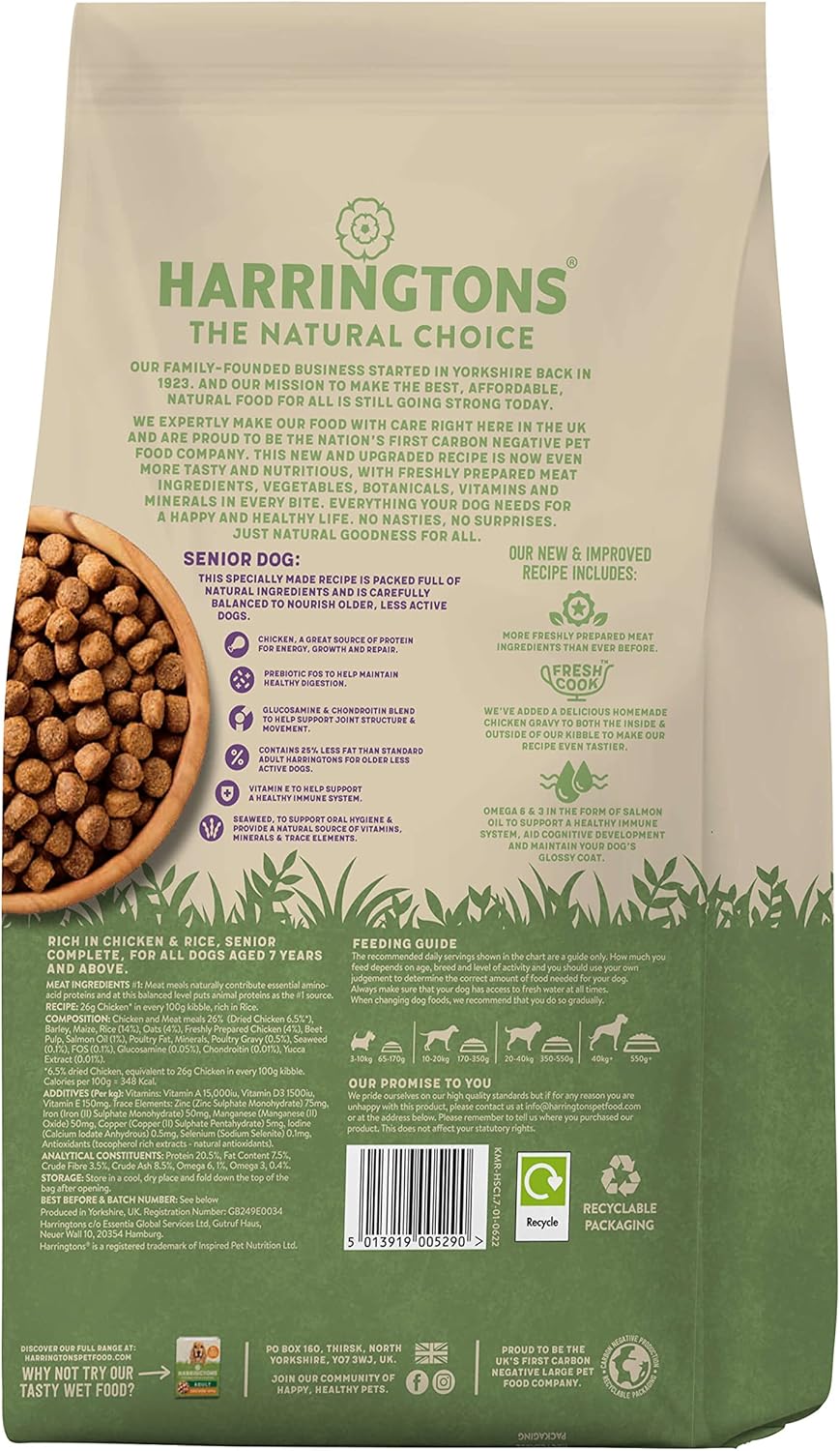 Harringtons Rich in Chicken & Rice Senior Dog Food 1.7kg is a nutritious, complete meal designed for senior dogs, featuring high-quality chicken as the main protein. With rice for easy digestion and balanced energy, it supports healthy mobility and overall vitality. Enriched with essential vitamins, minerals, and omega fatty acids, it promotes joint health and a shiny coat. Free from artificial additives, it’s a natural choice for senior dogs.