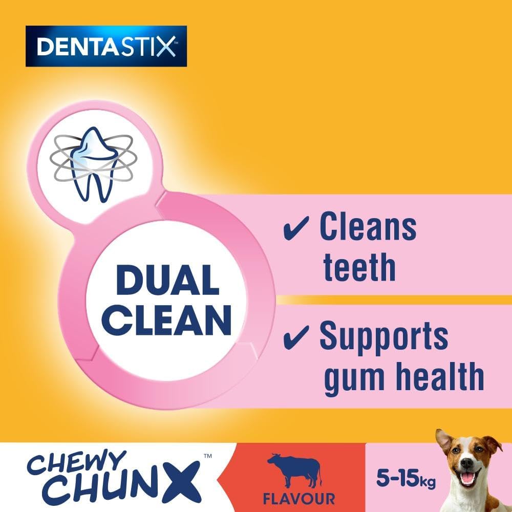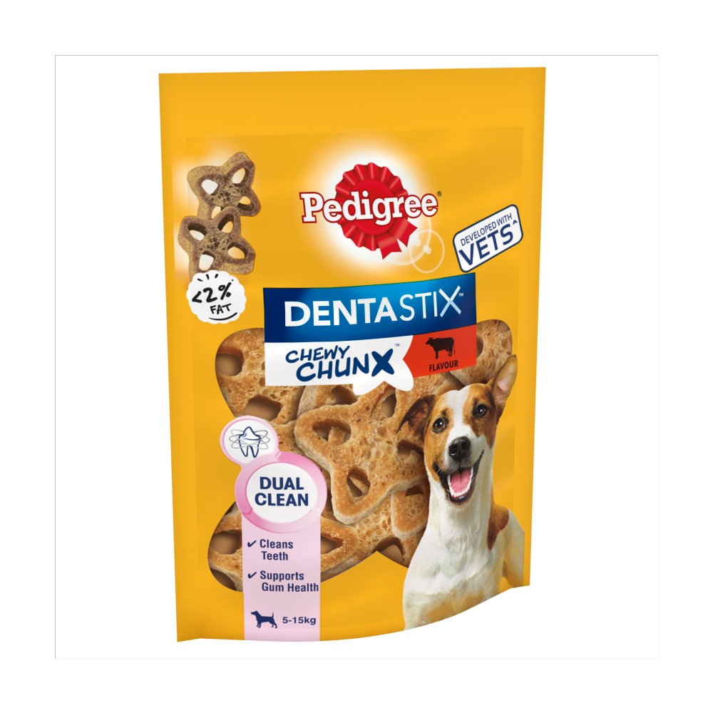 Dogs love to explorethrough their mouths, so its important to take care of their teeth by using specially made dog chews. Pedigree Dentastix Chewy ChunX treats are our specially designed dog chew sticks. With active ingredients, scientifically proven to clean with every bite, these beef dog treats come in mini size for 5-15kg dogs.