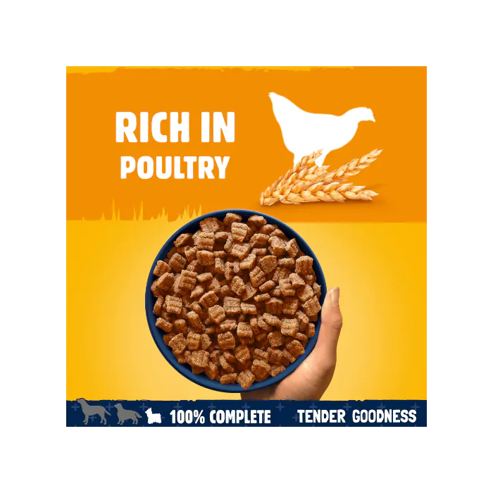Pedigree Tender Goodness Adult Small Dog Poultry Dry Food is 100% complete and balanced, made with selected natural ingredients, plus vitamins and minerals. It consists of tender chunks with the fresh taste of poultry your dog will love, in a convenient dry format.