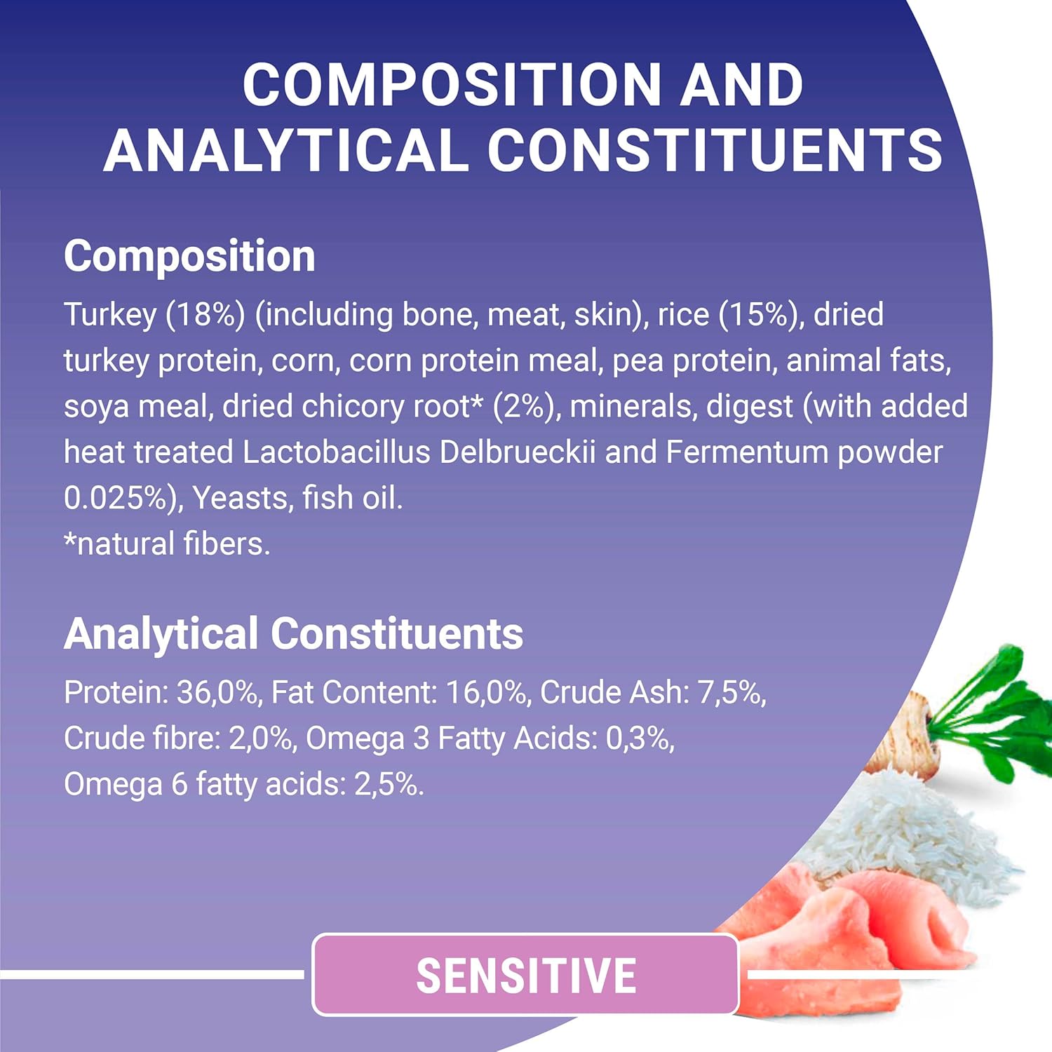 Turkey (18%) (including Bone, Meat, Skin), Rice (15%), Dried Turkey Protein, Corn, Corn Protein Meal, Pea Protein, Animal Fats, Soya Meal, Dried Chicory Root* (2%), Minerals, Digest (with added Heat Treated Lactobacillus Delbrueckii and Fermentum Powder 0.025%), Yeasts, Fish Oil, *Natural Fibers