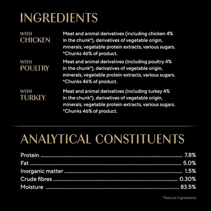 Poultry (minimum 20%), meat and animal derivatives, vegetable protein extracts, minerals, and additives.