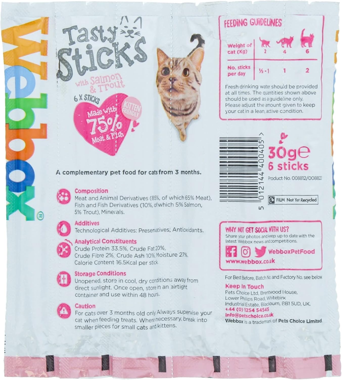 Webbox® perfect to feed at any time as a tasty snack or treat. Gently cooked to produce a delicious, moist, meaty treat your cat or kitten will adore! Each Tasty Stick is individually wrapped for freshness - to open, simply tear open from the top of the pack. Delivered and sold by Hungry Tails.