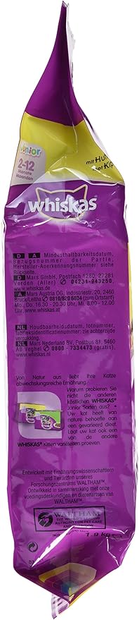 Crafted with high-quality chicken, cereals, animal derivatives, and essential vitamins and minerals, Whiskas Dry Cat Food delivers complete nutrition in every bite. The crunchy kibble promotes dental health, while the balanced formula ensures your cat stays energetic and healthy.