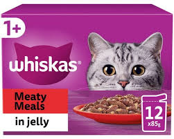 Whiskas 1+ Meaty Meals Adult Wet Cat Food Pouches in Jelly provide a delicious and nutritious option that your cat will love. Each 85g pouch features tender meat pieces in a savory jelly, delivering essential nutrients for your cat's health and vitality. This pack of 12 ensures mealtime variety and satisfaction for your feline friend.